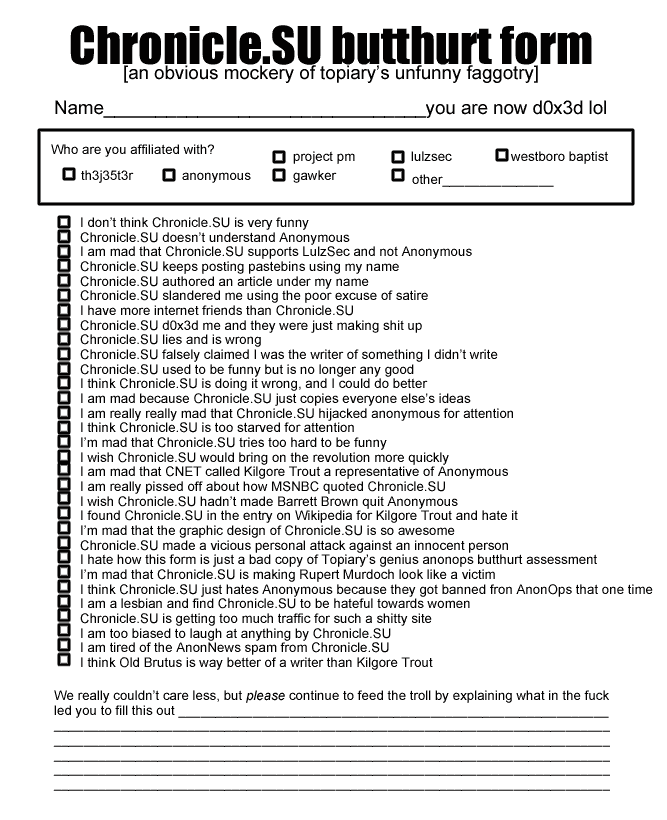 A mouth-breathing little twerp could figure out who we are just by looking around the site a little. In fact, it’s happened before. Skiddie fanboys of Anonymous repeatedly published the name of one of our former writers with no good reason. In response to their stupidity, I anonymously posted my own fabricated d0x on AnonNews and fooled the hivemind completely. Every time I insulted Anonymous, they posted the d0x and I laughed at their gullibility. It is well documented that I created those d0x as a joke, and th3j35t3r published them anyway, unwittingly trolling himself into oblivion. He is less skilled than the average rage-filled teenybopper Anon.