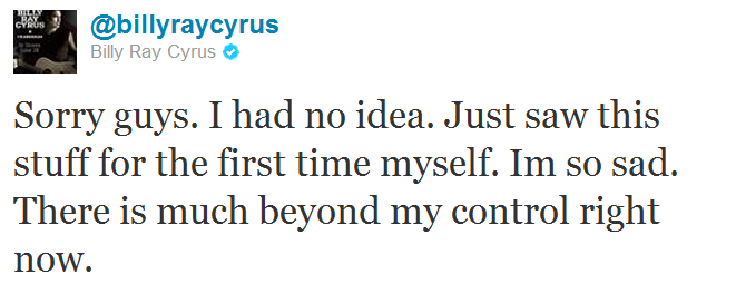 Miley’s father, Billy Ray Cyrus was not present at his daughter’s press conference, and when questioned about his daughter’s pregnancy via Twitter, Cyrus tweeted the following: