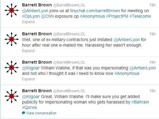 A lot of people are now saying Barrett Brown is a “performance artist” or a “satirist” and that he was not serious about these threats. While that certainly confirms everything I want to believe about him, because I’m an Official Anonymous Spokesperson and Representative as well, it just doesn’t hold any ketchup. The feds have never “come after me,” and I’ve written just as many Anonymous screeds as Brown, if not more! Some of which have been circulated far beyond the reach of Barrett Brown. But you don’t know me because I totally take the Anonymity thing seriously and I’m more into teachin’ people stuff than just confirming their bias.