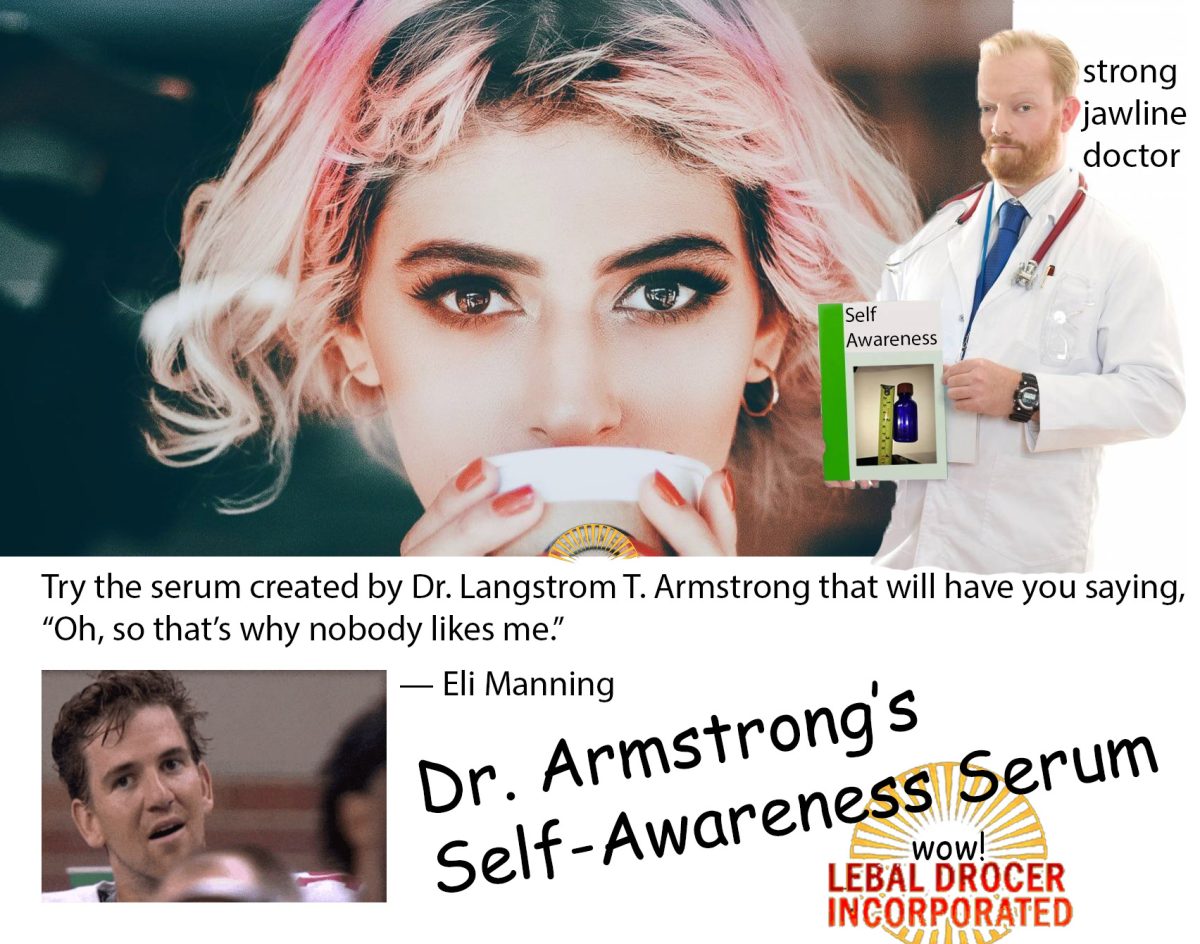 That’s why we’ve invented Dr. Troubadour’s patented Armstrong Self-Awareness Serum. It grows real, natural self-awareness in 31 days!
