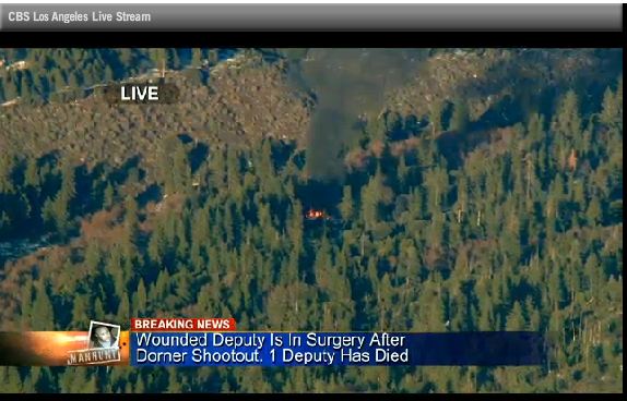 BIG BEAR, CALIF. — Chris Dorner shot and killed a police deputy in a gunfight outside a cabin in the Big Bear Lake area, where he is currently hiding. The cabin is on fire.