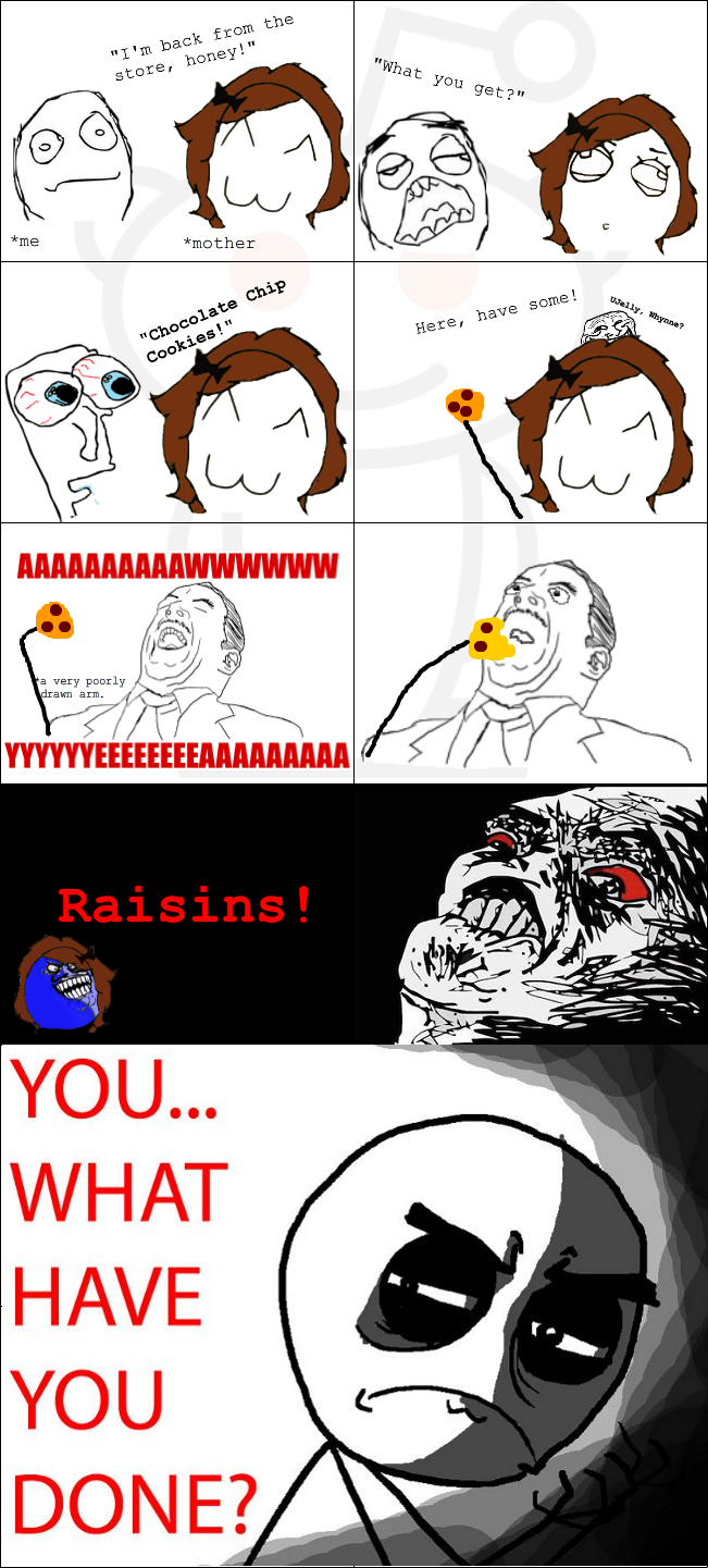 If you know anything about the history of rage comics, this is the one that will put you over the line. This is the one that made me post this story. One of the most famous faces in rage comics is "raisins" face. The face a person makes after biting into a cookie, thinking it's filled with chocolate chips, only to realize it is raisins. The maker of this rage comic didn't use the raisin face.