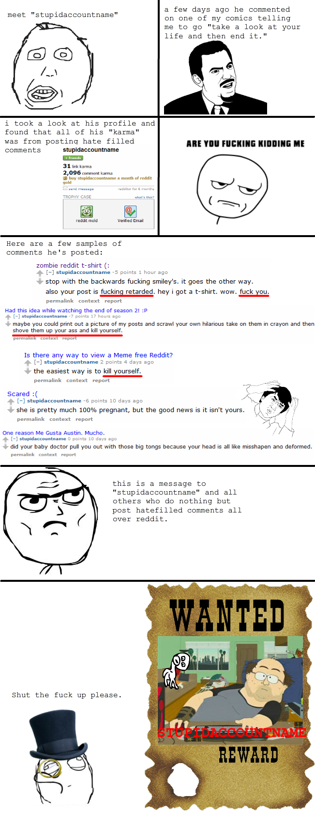 I think it’s messed up for you to critize rage comics off of such a small number. I’ve read soo many funny rage comics, and here you think 5-6 is enough to officially declare them dead. Just because It makes yo u feel better to have someone to look down at. People do that often, infact, making other people look worse to make themselves look better. I suggest u stop using reddit, because its full of a bunch of dumb hypocrites who crave attention