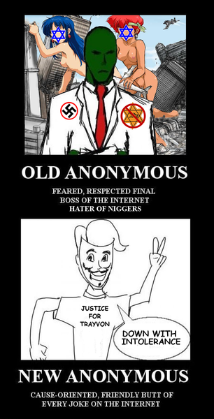 This mythical Anonymous and “his” many famous pranks formed a strong and mutually determinate relationship with “events” in the news media. Much early reporting on Anonymous pranks relied heavily on a naive (but sensational) reading of the sinister and all-powerful Anonymous mythology, creating a feedback loop which very quickly inspired emphasis of the powerful aspect, “hackers on steroids,” over the humorous. A distinct ideology and aesthetic constructed and were constructed by this feedback loop, and vestigial values of the prankish, leaderless, and mostly unmoderated 4chan forum became deflated and at times inverted as a consequence of hegemonizing processes — power must preserve and expand power to persist. The faceless green jokester splintered into a sea of Guy Fawkes masks and the Anonymous myth re-centered itself on power as power imposed itself upon Anonymous.