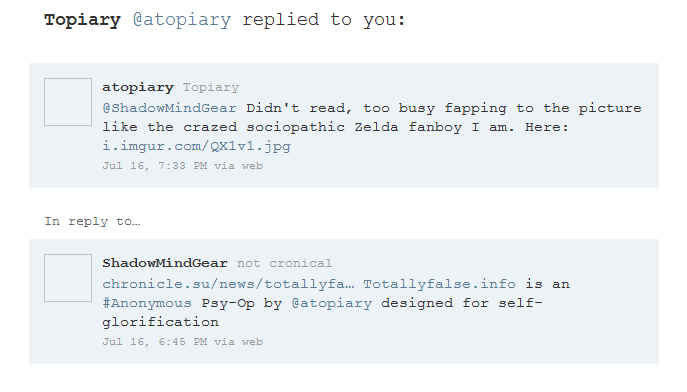 Because of the prevalence of misinformation, fake d0x, and insane conspiracies, this is an understandably exploitable source of endless humor. However, Totallyfalse.info is written by Topiary, a piece of shit Zelda fan who jerks off to Princess Ruto. As such, it is completely insufferable and as full of fail as possible.