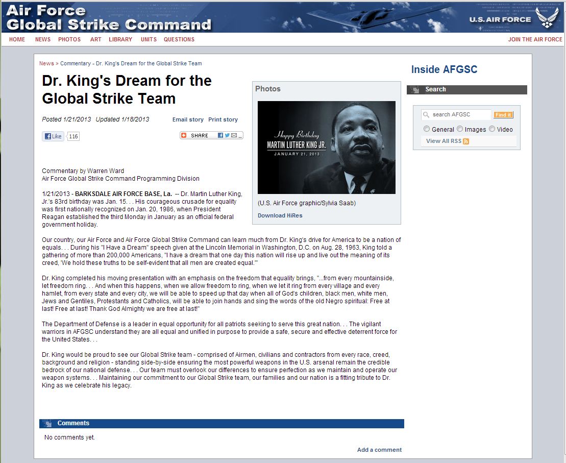 Dr. King would be proud to see our Global Strike team – comprised of Airmen, civilians and contractors from every race, creed, background and religion – standing side-by-side ensuring the most powerful weapons in the U.S. arsenal remain the credible bedrock of our national defense. . . Our team must overlook our differences to ensure perfection as we maintain and operate our weapon systems. . . Maintaining our commitment to our Global Strike team, our families and our nation is a fitting tribute to Dr. King as we celebrate his legacy.